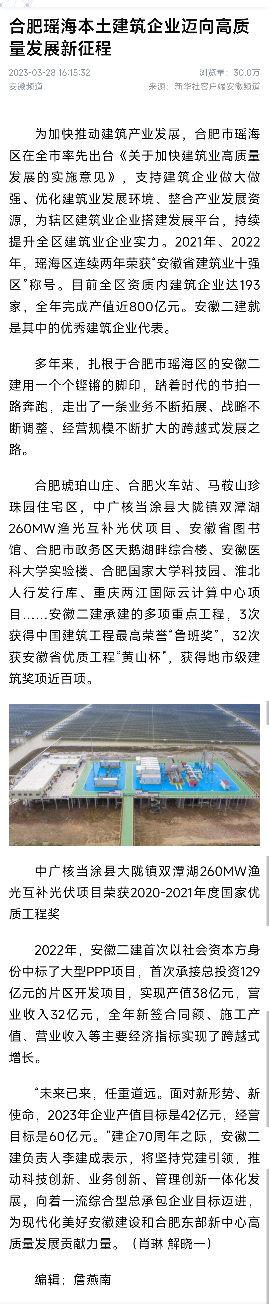 時光向前,二建向上!3月28日,自人民網、央廣網、中國網、中國日報網、安徽日報客戶端等主流媒體集中報道安徽二建七十年發展成就后,公司作為合肥瑤海本土優秀建筑企業邁向高質量發展新征程,首次刊登在新華社客戶端安徽頻道,一經報道瀏覽量達30萬次。