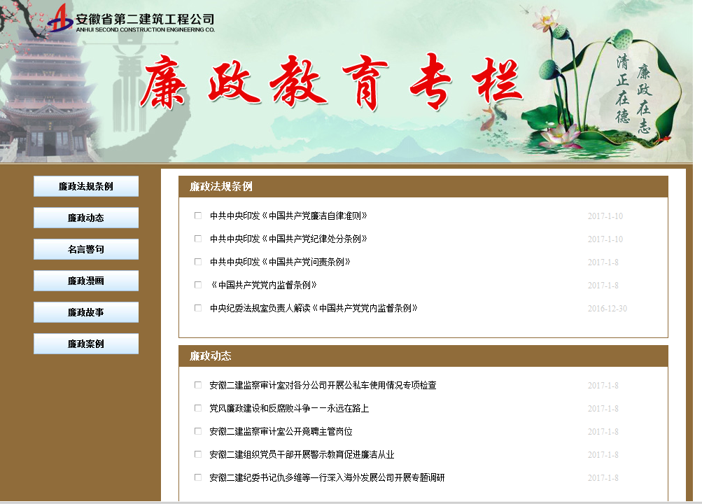 該專欄以公司網站為依托,設有廉政法規條例、廉政動態、名言警句、廉政漫畫、廉政故事、廉政案例六大板塊。通過廉政法規條例,轉載《中國共產黨廉潔自律準則》、《中國共產黨紀律處分條例》、《中國共產黨問責條例》、《安徽省預防職務犯罪條例》等一系列黨紀黨規、國家法律法規知識,并在每一次修訂后及時更新,為廣大黨員干部學習使用提供方便。運用廉政動態,及時發布集團紀委和公司黨委、紀委通知要求,通報監察審計事項與結果,做到監督的公開化、透明化。以名言警句、廉政漫畫、廉政故事、廉政案例感染人、陶冶人,內容直觀形象,用勤廉典型激勵人,深入剖析典型違紀案例,加強警示教育。