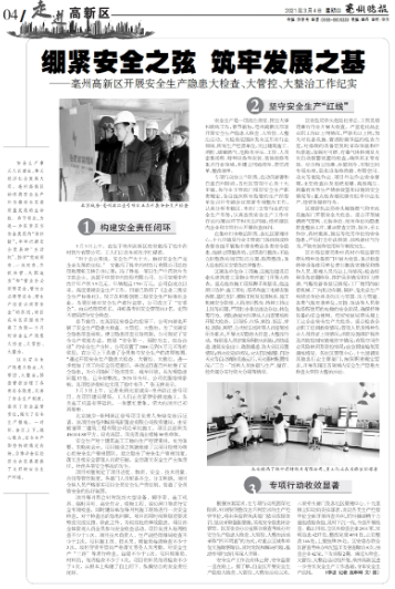 年后復(fù)工不久,亳州市高新區(qū)即對轄區(qū)內(nèi)的施工單位進行逐個復(fù)工復(fù)產(chǎn)以及安全生產(chǎn)隱患大檢查、大管控、大整治。3月3日上午,亳州市高新區(qū)建管主任、第五管理中心主任、環(huán)保中心主任等領(lǐng)導(dǎo)以及亳州市記者來到亳州濱江壹號項目進行實地現(xiàn)場檢查,并采訪了項目經(jīng)理朱曉亮。在聽取項目匯報、查閱安全管控資料后,當(dāng)?shù)馗髦鞴懿块T領(lǐng)導(dǎo)充分肯定了項目在現(xiàn)場安全、環(huán)保管控等方面的有力舉措,并在亳州晚報上刊登了項目全方位的安全管理體系。