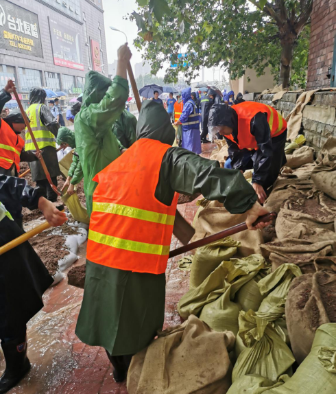 一分公司文一·塘溪津門項目全體人員積極響應公司及建設單位的號召,立即展開了一系列的抗洪搶險工作。針對D-09-04地塊金斗公園內部河道漫水至工地影響現場安全的情況,及時在河道漫水區域堆放沙袋,封堵漫水口,保河堤戰洪水,抗洪搶險奮戰一線。