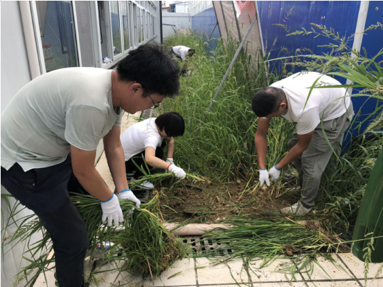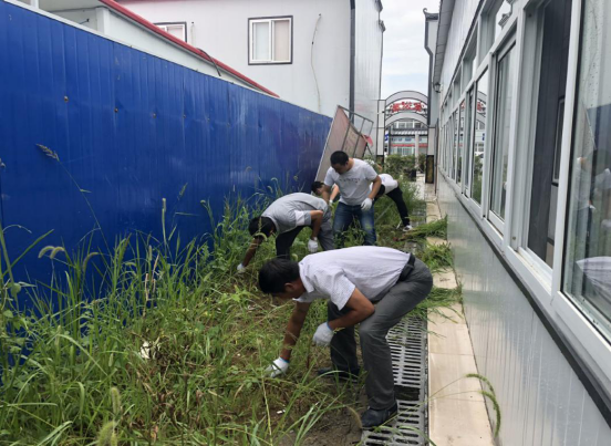 725下午四時,大家頂著炎炎烈日對項目部辦公區周邊雜草進行清理。每位同志干勁十足,充分發揮團隊協作精神,炎熱的天氣擋不住火熱的激情。經過一個多小時的努力,院內雜草全部清除干凈,環境煥然一新。