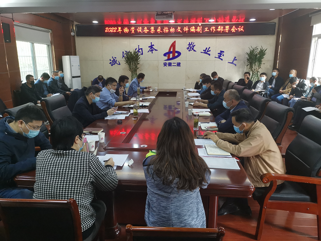 4月19日上午,安徽二建公司在一樓會議室召開2022年物資設備集采工作部署會議。公司總經理李建成、副總經理葉和永以及相關職能部門負責人、所屬各單位行政負責人、生產副經理及相關科室負責人參加會議,會議由公司副總經理、總工程師費勤波主持。